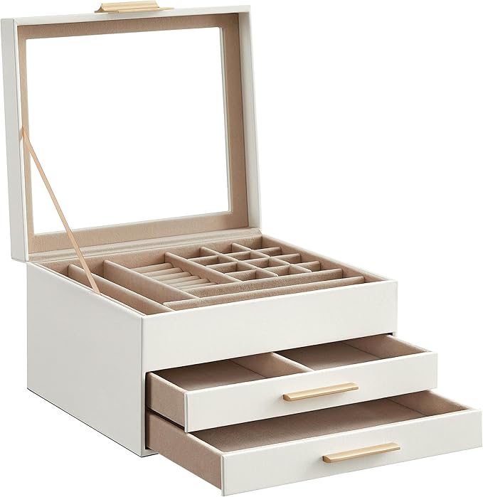 [Şeffaf cam kapak] En sevdiğiniz mücevherlerin tümü şeffaf cam kapağın altında bir bakışta görülebilir. Sadece şık bir şekilde sunulmakla kalmıyor, aynı zamanda toza karşı iyi korunuyor ve dayanıklı bir mücevher kutusu